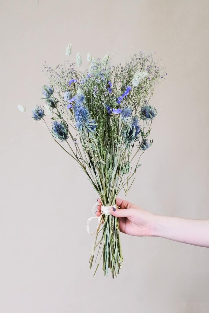 En variation med en af vores smukke bund-buketter, bundet med phalaris og grøn gyps for en unik og billig buket.